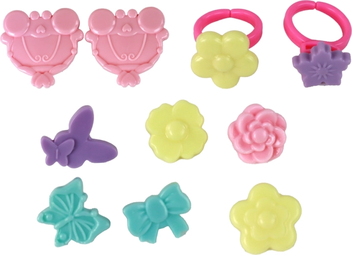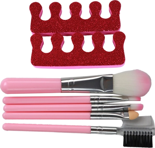 Dvě rtěnky, dva laky s oddělovači prstů, tvářenka, tři stíny a pět štětců – vše pro nekonečné kombinace dětského líčení a péče o nehty.