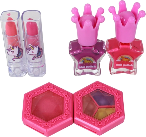 Kouzelný dětský make-up set v růžovém kufříku s motivem jednorožce pro kreativní hru a napodobování dospělých. Obsahuje rtěnky, laky na nehty, tvářenku, stíny, pět štětců, separator prstů a růžové sandálky na podpatku. Ideální pro malé parádnice – bezpečná zábava, rozvoj fantazie a stylu.
