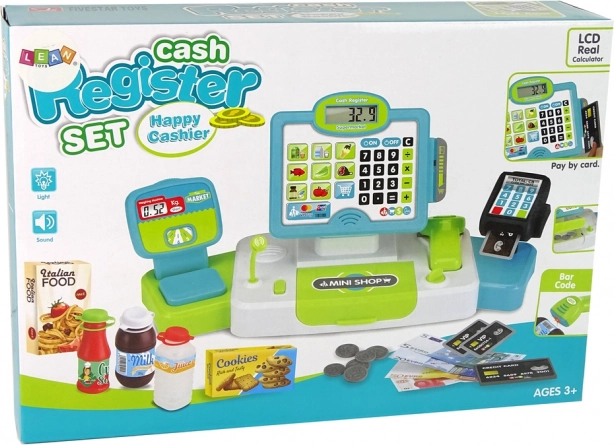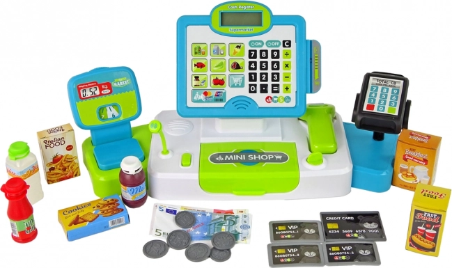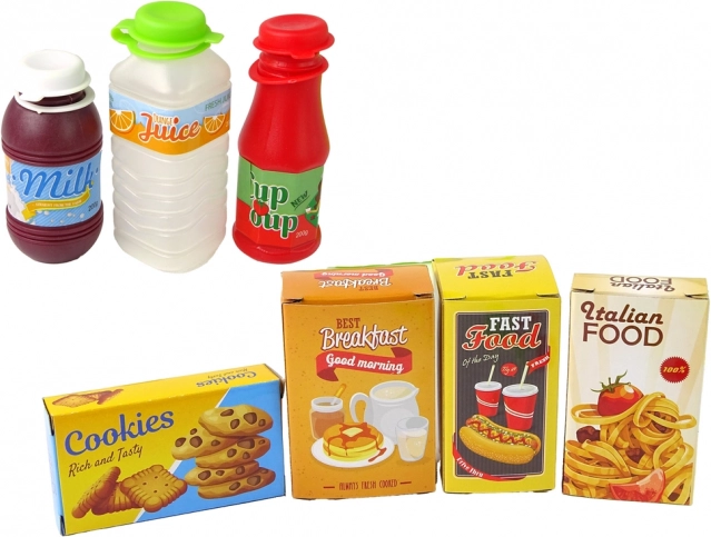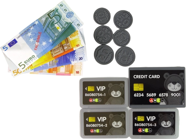 Součástí sady jsou i peníze, karty a různé produkty, které dětem umožňují simulovat nákupy a rozvíjet matematické dovednosti.