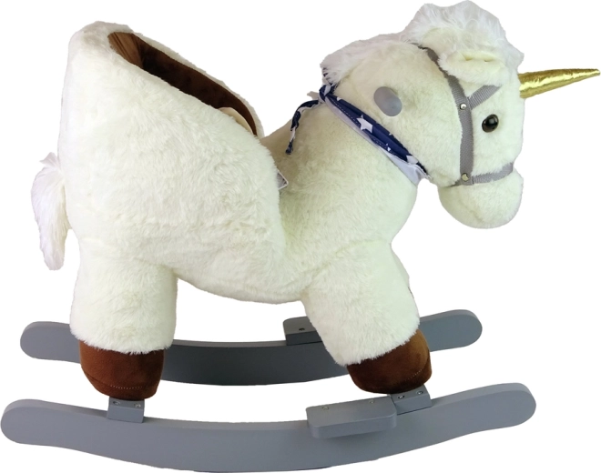 Roztomilý houpací jednorožec v bílé barvě kombinuje měkký plyš, stabilní dřevěnou konstrukci a zabudované bezpečnostní pásy pro pohodlnou a bezpečnou zábavu. Díky praktickému sedátku, úchytům a zvukovým efektům si děti užijí kouzelnou jízdu, která podporuje koordinační schopnosti a rovnováhu.
