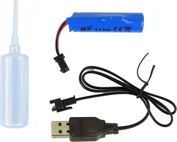 V balení najdete dobíjecí Li‑ion baterii, USB kabel pro pohodlné nabíjení a lahvičku na vodu pro parní efekt. Vše připravené k rychlému startu.
