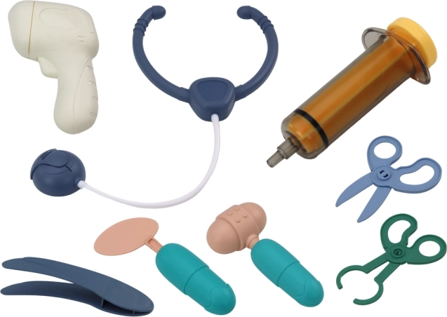 Set obsahuje vše potřebné k základní „ordinaci“: stříkačku, nůžky, stetoskop a další doplňky. Je vyroben s ohledem na bezpečnost a splňuje normy CE a EN71, takže je vhodný pro děti od 3 let.