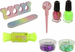 Tento nádherný kosmetický set obsahuje mnoho atraktivních prvků, které potěší každou mladou nadšenkyni stylu. Kosmetický separátor pomůže při lakování nehtů, zatímco dva lesky na rty dodají kouzlo a lesk. Pilníček a tři laky na nehty, z toho dva s třpytkami a jeden s jasnou barvou, umožní kreativní zdobení nehtů různými vzory.