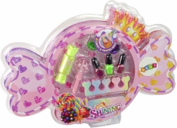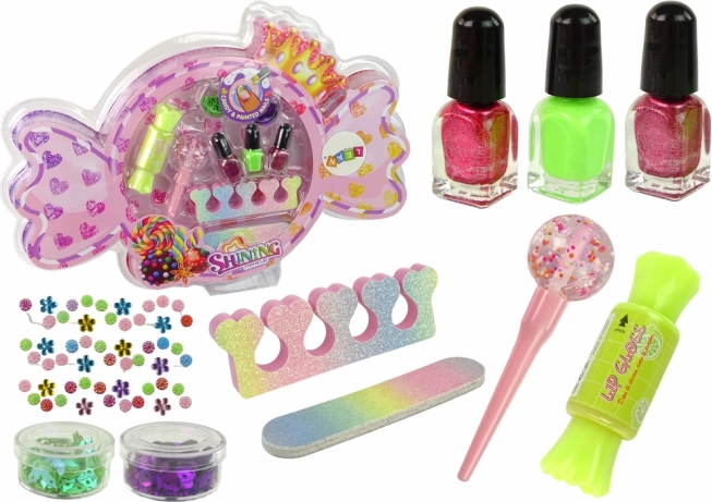 Součástí jsou také ozdobné nálepky a dva kontejnery s ozdobnými flitry, ideální pro tvorbu efektních dekorací. Je to kompletní vybavení pro malé kosmetické umělkyně.