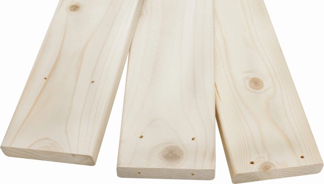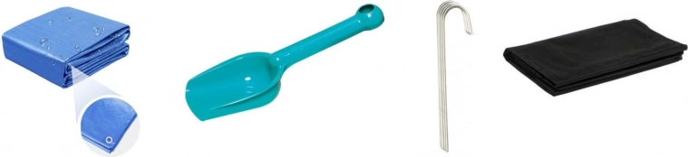 - Opracované desky, vruty, panty, netkaná textilie, krycí plachta, 4 háčky, plastová hračka do písku, návod
