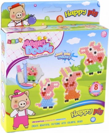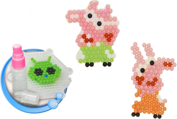Kreativní sada vodních korálků pro malé umělce nabízí 8 zářivých barev, dvě šablonové podložky (čtverec a šestiúhelník), rozprašovač a příslušenství pro snadné tvoření. Stačí postříkat vodou a korálky se spojí bez žehlení. Skvělá volba pro rozvoj jemné motoriky, fantazie a tvoření přívěsků a roztomilých motivů prasátek.