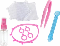 - Vodní korálky v 8 barvách, čtvercová a šestihranná podložka, pinzeta, aplikátor, rozprašovač (spray), doplňky na šperky a přívěsky, knížka s předlohami, originální balení