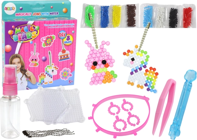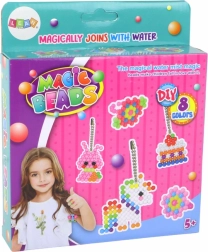 Vodní korálky jsou barevné kuličky, které se po postřiku vodou spojí do jednoho celku – bez lepidla a žehličky. Děti si mohou vytvářet nekonečné množství tvarů, postaviček a dekorací a následně je proměnit v přívěsky či ozdoby do pokoje.