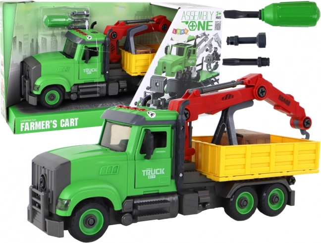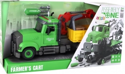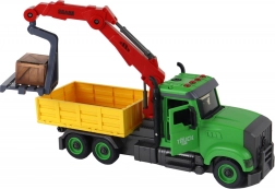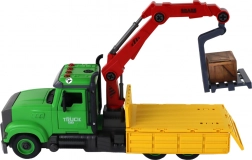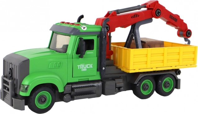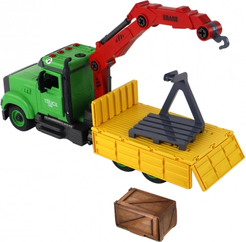 - Sklápěčka s jeřábem, šroubovák se dvěma bity, paleta s bednou, baterie (3 × 1,5 V)