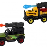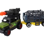 Dva robustní vozy s odpojitelnými přívěsy pro převoz dinosaurů. Otočné vystřelovače dodají hře akční prvek.