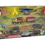 - 2 vozidla s přívěsy, 1 vrtulník, 6 dinosaurů, kleště