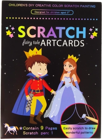 Tento kouzelný set obsahuje 9 škrabacích obrázků s motivy království, které děti milují. Jednoduchým seškrábnutím černé vrstvy se před očima objeví zářící barvy a krásné scény. Podporuje jemnou motoriku, kreativitu a souostředění.