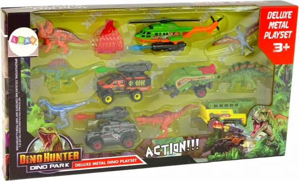 Hračka 'Dino Hunter' Deluxe Metal Dino Playset obsahuje různé plastové dinosaury, vozidla a helikoptéru. Dítěti nabízí akční a dobrodružnou hru plnou fantazie.