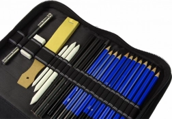 - 72 pastelek; 12 grafitových tužek různé tvrdosti; uhlí ve 3 tvrdostech; 3 nástroje na roztírání + čistič; gumka; strouhátko; prodlužovač tužek