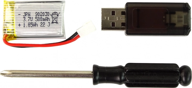 V balení najdete akumulátor 3,7 V 500 mAh, USB nabíječku a šroubovák – stačí vložit AA baterie do ovladače a hrát.