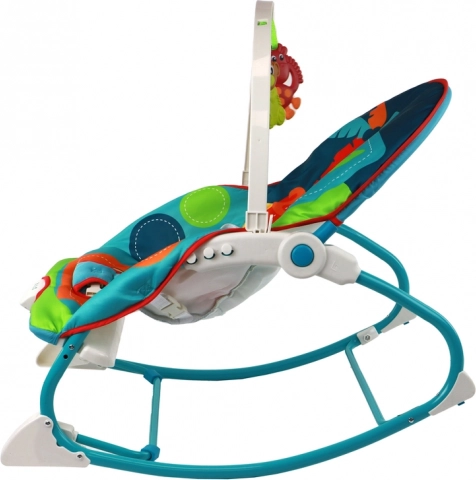Lehátko má nastavitelný sklon opěráku, což umožňuje přizpůsobení podle individuálních potřeb dítěte. Zelené a modré barvy vytvářejí příjemné a povzbuzující prostředí. Lehátko lze přeměnit na stabilní sedačku rozložením modré nožky.