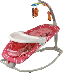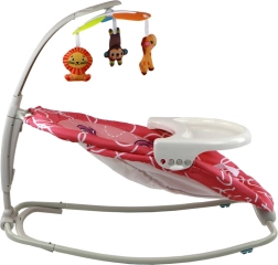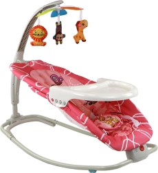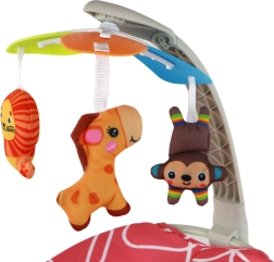 Odnímatelná hrazdička s kolotočem a třemi zvířátky (lev, opička, žirafa) s chrastítky rozvíjí zrak, sluch i motoriku. Integrované vibrace a melodie pomáhají miminko zklidnit a navodit spánek. Jednoduchým rozložením přední nožky a stolečku proměníte houpačku v pevné křesílko pro krmení či hraní.