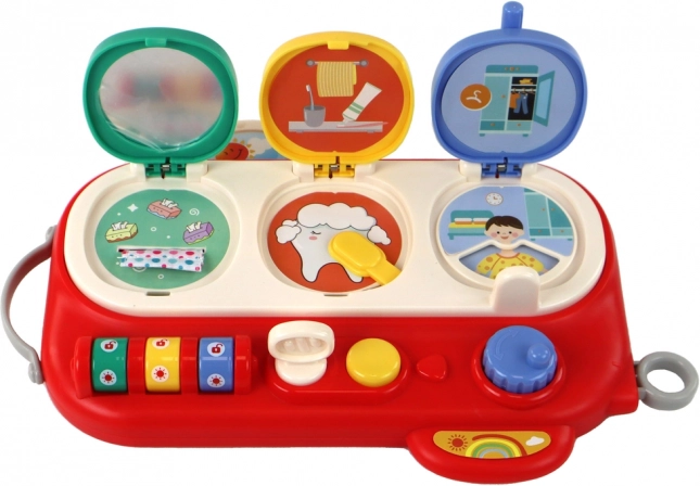 Tato kompaktní tabule (23 × 15 × 5 cm) propojuje učení a hru. Děti mohou objevovat tři barevná okénka s unikátními úkoly: zelené s „tajemstvím“ na kód, žluté s motivem zubu a pohyblivým kartáčkem pro nácvik hygieny, a modré s výměnným oblečením na otočném kolečku. Nahoře nechybí ukazatel dne a noci, který zábavně seznamuje s časem.