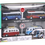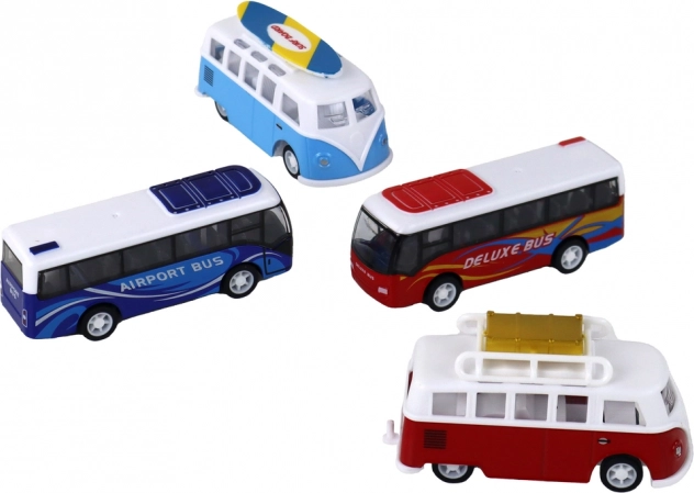 V balení najdete 2 kampery (červený a modrý) a 2 autobusy (modrý „Airport Bus“ a červený „Deluxe Bus“) doplněné o dopravní značky. Odolné zpracování a realistické detaily (okna, sedačky, střešní nosič či surf) dělají ze sady perfektní dárek pro malé milovníky vozidel.