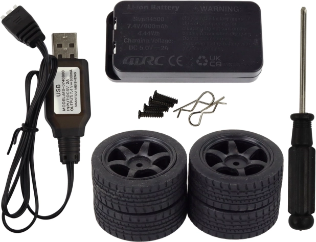Pohodlné řízení s volantem a spouští plynu, stabilní přenos bez rušení a praktické doplňky: USB nabíječka, Li‑ion baterie, náhradní pneumatiky a nářadí.