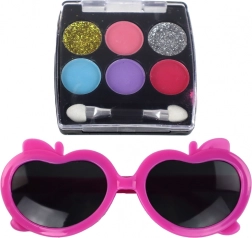 - 2× rtěnka (červená), paletka očních stínů (růžová, fialová, modrá, třpytivá stříbrná a zlatá), 2× paletka na konturování, dětské růžové brýle ve tvaru srdce, štětce na líčení, separátor prstů, pilník na nehty, 2× lak na nehty, plastové pouzdro donut s řetízkem