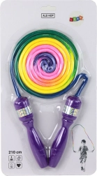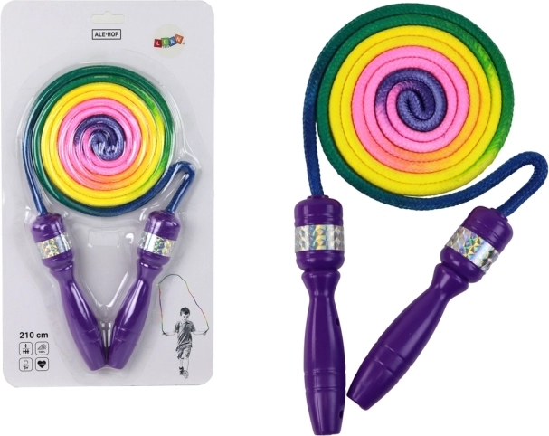 Barevné švihadlo v duhovém provedení s fialovými rukojeťmi přináší dětem spoustu zábavy a zdravého pohybu. Podporuje koordinační schopnosti, fyzickou kondici a posiluje svaly nohou i paží. Díky atraktivním barvám motivuje děti ke každodennímu pohybu. Délka švihadla je 210 cm, výrobek má certifikaci CE a splňuje normu EN71.