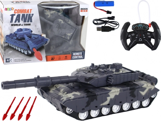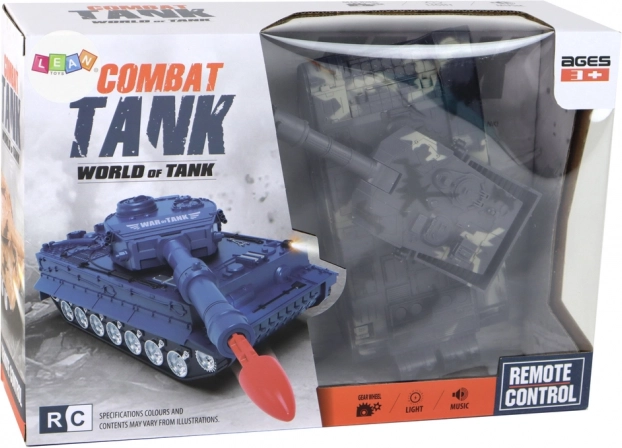 Součástí balení je dálkový ovladač umožňující pohyb tanku všemi směry, což usnadňuje ovládání a poskytuje plnou kontrolu nad pohyby.
