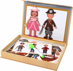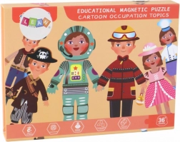 V sadě najdete puzzle s motivy kreslených postav, jako jsou pirát, kosmonaut, kovboj a mnoho dalších. Každá postava se skládá z několika magnetických prvků, což umožňuje dětem jejich libovolné spojování a experimentování. Možnost výměny hlav, těl a nohou dělá zábavu neomezenou a dítě může samostatně tvořit zcela nové postavy a vytvářet originální příběhy.