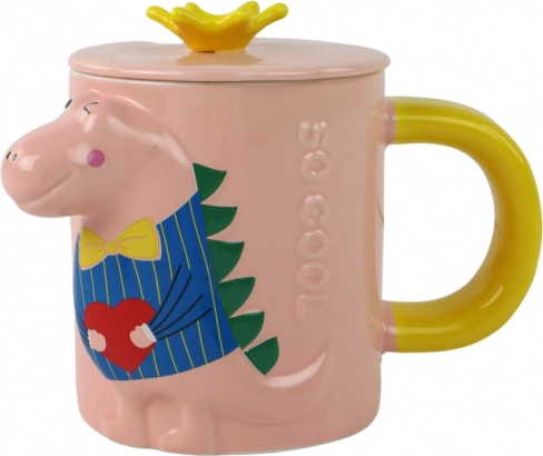 Tento stylový keramický hrnek kombinuje funkčnost a hravý design. Růžové tělo se žlutým uchem doplňuje víčko se žlutou korunkou, které chrání nápoj a dotváří originální vzhled. Reliéfní 3D motiv dinosaura dodá každému doušku radost – ideální na kávu, čaj i kakao.