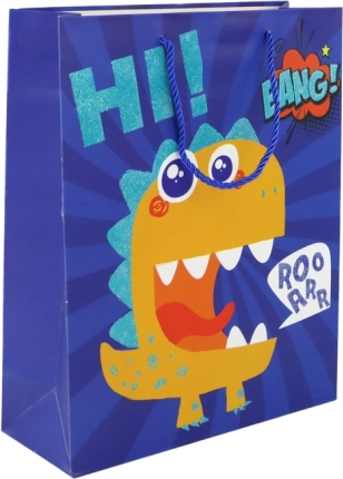 Dodáte svým dárkům šmrnc s modrou papírovou taškou s veselým dinosaurem. Kvalitní papír s jemným třpytem a pevné provázkové uši zvládnou bezpečně přenést překvapení a zároveň se postarají o krásnou prezentaci.