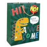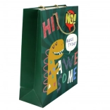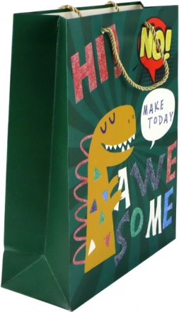 Stylová papírová dárková taška v tmavě zelené barvě s veselým motivem dinosaura a jemnými třpytkami. Díky pevným zlatým provázkovým uchům je praktická, odolná a skvěle se hodí na narozeniny, dětské oslavy i svátky.