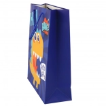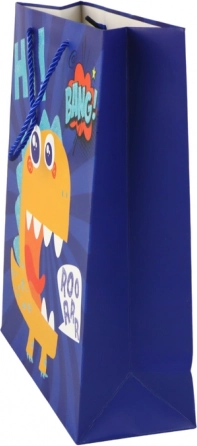 Stylová papírová dárková taška s veselým motivem dinosaurů v elegantní tmavě modré barvě. Pevné šňůrkové ucho, dostatek prostoru a rozměry 41,5 × 30 × 12 cm z ní dělají ideální volbu pro narozeniny, dětské oslavy i svátky.