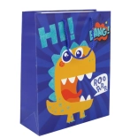 Tato dárková taška s hravým dinomotivem dodá každému dárku zábavný a originální vzhled. Univerzální tmavě modrý podklad působí elegantně, zatímco výrazná grafika osloví zejména děti. Taška je vhodná pro různé příležitosti – od narozenin po dětské párty.