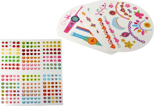 Po vyjmutí plastové přihrádky se odhalí sada dočasných tetování ve tvaru hodinek, náhrdelníků, náušnic a prstýnků – ideální pro hravé experimentování s doplňky bez závazků. Kufřík podporuje kreativní hru, rozvoj jemné motoriky a vkus dětí.