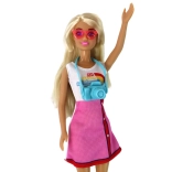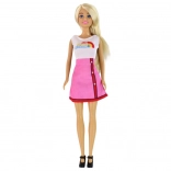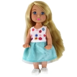 Panenka Dcerka je oblečená v bílém tričku s barevnými květy a světle modrou sukní, připravena pro dětskou hru.