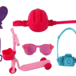 Sada je ideální pro hraní na rodinu, procházky a vytváření vlastních příběhů. Doplňky jako růžová koloběžka, fialový balónek ve tvaru srdce, růžová helma a modrý fotoaparát dodávají hře na zábavnosti.