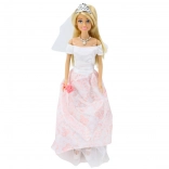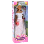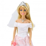 Představujeme vám krásnou svatební panenku, která rozzáří každou dětskou hru. Oblečená v dlouhé bílé róbě se světle růžovými detaily přináší eleganci a šarm. Panenka drží kytici, která dokonale ladí s jejím sofistikovaným vzhledem.