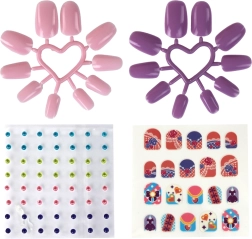 Obsahuje umělé nehty, samolepky a laky na nehty ve dvou barvách pro různé stylizace.