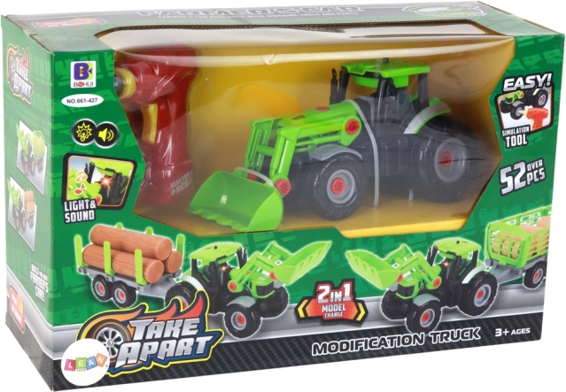 Zábavný a vzdělávací set pro malé kutily: traktor s přívěsem, který si děti mohou samy složit a rozložit. Součástí je i dětská vrtačka/šroubovák. Hračka nabízí realistické zvuky motoru a světelné efekty, rozvíjí jemnou motoriku, kreativitu a logické myšlení.