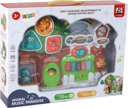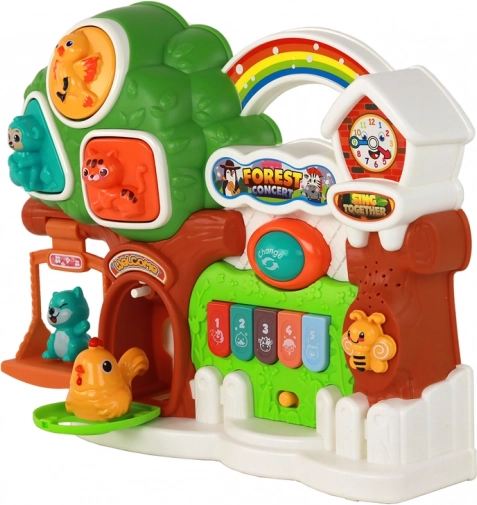 Tento hudební panel ve tvaru stromového domečku nabízí dětem pestrý svět objevování. Na větvích najdou roztomilá zvířátka a houpačku, v koruně interaktivní prvky a dole klaviaturu s pěti klávesami. Stiskem tlačítek děti spouštějí melodie, zvuky kočičky, ptáčka a opičky a světelné efekty, které podporují rytmus a vnímání.