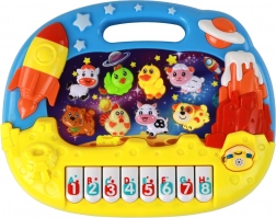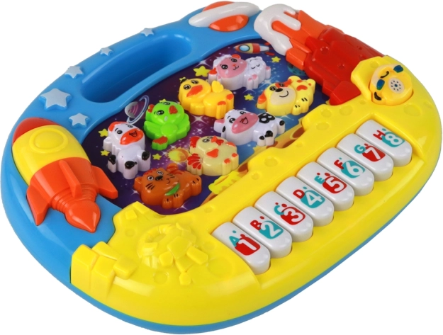 - Motiv vesmíru rozvíjí dětskou představivost a propojuje klávesy se zvuky zvířat a čísly.