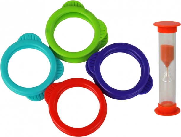 Sada obsahuje kroužky ve čtyřech barvách a klepsydru pro rychlé soutěžní kolo. Nastavte čas a zkuste nasadit co nejvíce kroužků, než písek doběhne.