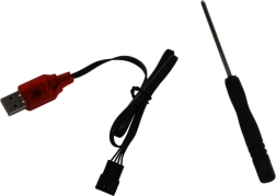 V balení najdete vše pro okamžitý start: model s akumulátorem 7,4 V 500 mAh, USB nabíječku, vysílač a samolepky pro personalizaci. Stačí doplnit 2× AA baterie do ovladače.