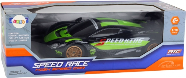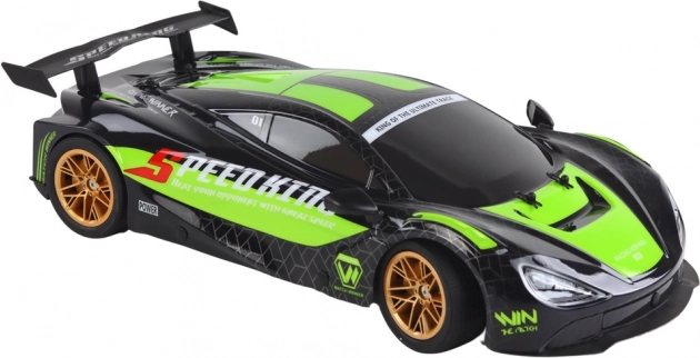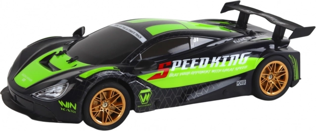 Užijte si adrenalin s tímto RC sportovním autem v měřítku 1:10 v zeleno‑černém designu se zlatými disky. Nabízí rychlost až cca 25 km/h, plynulé řízení na 2,4 GHz, světelné efekty a napájení z 7,4V akumulátoru. Ideální pro zábavu venku i doma pro děti od 6 let.
