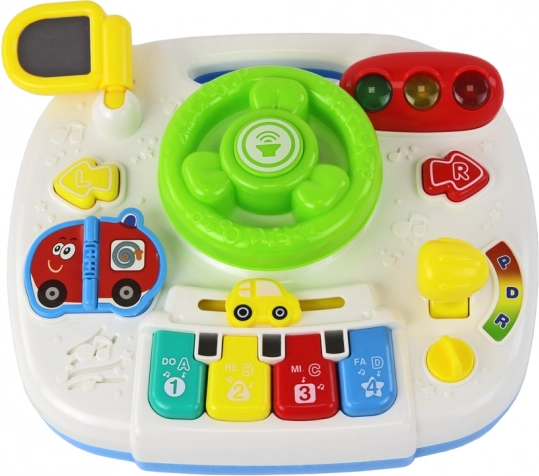 Dětský volant s klaksonem, blinkry a světelnou signalizací učí pochopit základní pravidla silnice a zlepšuje koordinaci pohybů zábavnou formou.
