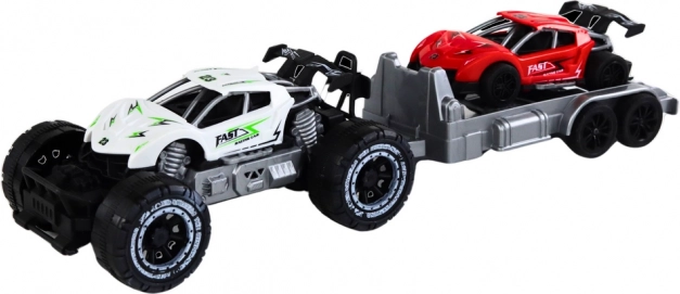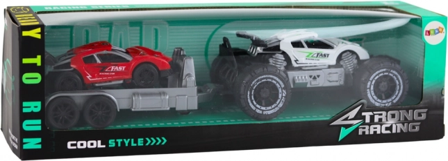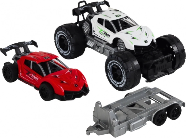 Off-road auto a červené sportovní auto na přívěsu představuje skvělou sadu hraček pro děti, které milují automobilová dobrodružství. S robustními koly a pevnou konstrukcí je připraveno pro jakékoli terénní výzvy.