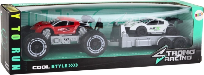 Tato detailně zpracovaná sada přenese děti do světa off-road dobrodružství. Červené terénní auto s výraznými koly vypadá jako skutečný off-road vůz, zatímco odpojitelná plošina veze kompaktní bílé sportovní auto připravené na závody i záchranné akce.