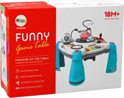 Stoleček stojí na čtyřech červených nožkách, které lze odebrat, takže je možné hrát si přímo na podlaze. Druhá strana stolečku má výstupky pro skládání kostek a senzorické hry.