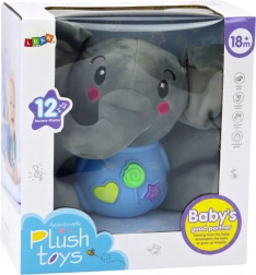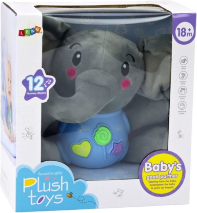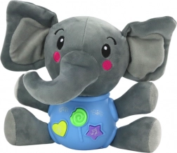 Roztomilý interaktivní plyšový slon v modré barvě (19 cm) z hebkého materiálu nabízí tři tlačítka: zvuky přírody, anglické říkanky a 5 veselých melodií. Skvělá hračka pro rozvoj smyslů a jazyka od 18 měsíců, napájení 2× AA.