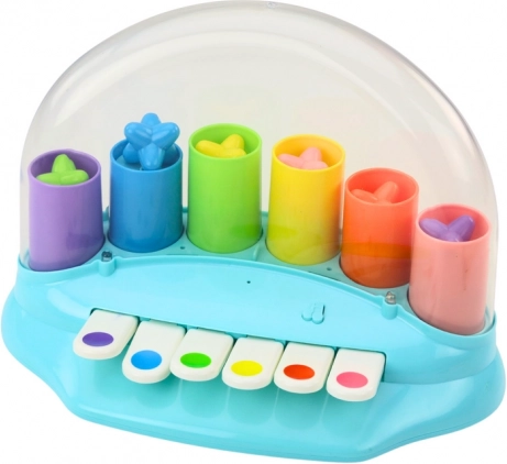 Objevte kouzelný svět hudby a barev s tímto interaktivním pianinkem pro nejmenší. Každé stisknutí klávesy spustí melodický zvuk a vyskakující barevné hvězdičky v průhledné kopuli, které padají po speciální dráze. Zábavná a edukační hračka podporuje rozvoj smyslů, jemné motoriky a koordinace oko–ruka. Modré provedení zaujme na první pohled a láká ke hraní i objevování.